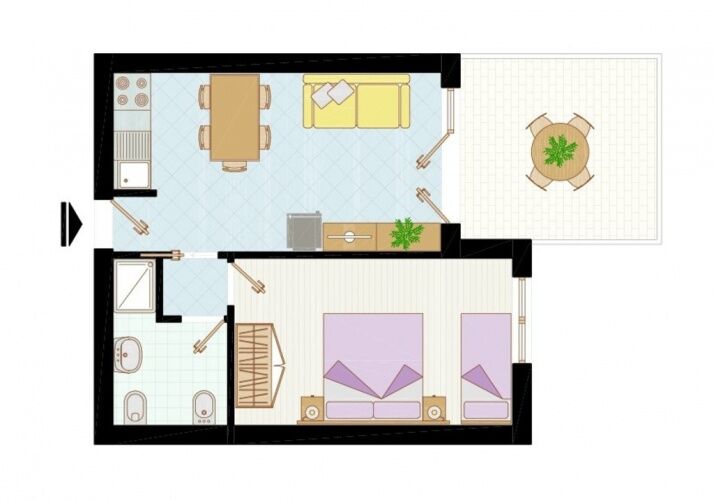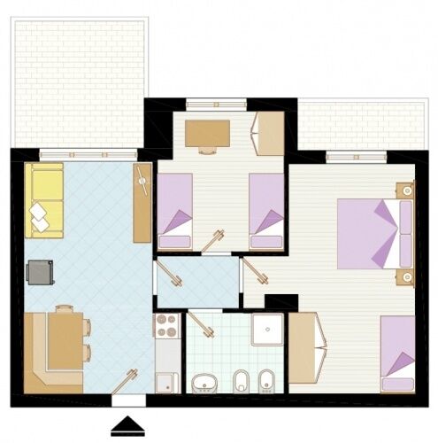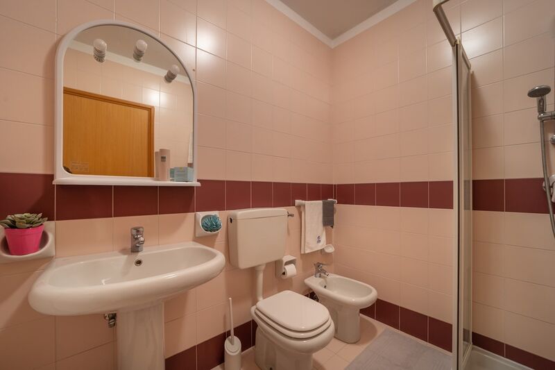 D1-8 apartman: Négy légterű apartman, egy nappalival (kanapé), egy szobával (franciaágyas szoba és egy egyszemélyes ágy) és 2 db kétágyas szobával rendelkezik. Az apartmanhoz főzősarok, 2 fürdőszoba, tágas erkély és légkondicionáló is tartozik.