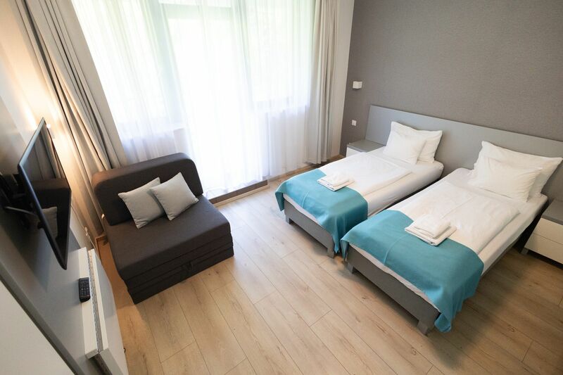 A szálloda 42 db modern, kényelmesen berendezett, nem dohányzó szobával rendelkezik, köztük standard, mozgáskorlátozott és összenyitható szobákkal, valamint családi apartmanokkal. Minden szoba okos TV-vel, légkondicionálóval felszerelt. A szobák uralkodó színe a türkiz és a szürke, amely elegáns harmóniát tükröz. A standard szobákhoz zuhanyzós fürdőszoba és erkély is tartozik. Minden emeleten kontakt szobák is találhatók, melyek baráti társaságok vagy nagyobb családok kellemes tartózkodását teszik lehetővé. A szobákban és a közösségi terekben ingyenes WiFi elérés biztosított.