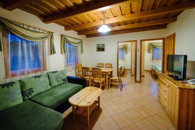 Apartmanházak: 2019. októberétől 8 darab 50 m2 alapterületű apartmannal bővült a szálláshely, melyek max. 4 felnőtt+2 gyermek fogadására alkalmasak (a főépület mellett mintegy 100 m-re, a focipálya után találhatóak, nincs fedett folyosó az apartmanok és a főépület között). Pótágy bekészítésére nincs lehetőség! A telefonnal, bútorszéffel, fürdőköntössel, wellness törölközővel, ingyenes vezeték nélküli internet csatlakozással felszerelt apartmanok mindegyikében két hálószoba franciaággyal (2-2 fő), tágas nappali kihúzhatós ülőgarnitúrával (további 2 fő), 1 darab fürdőszoba (zuhanyzóval, hajszárítóval) és külön WC, berendezett konyhasarok (hűtőszekrény, mikrohullámú sütő, vízforraló és 6 fő részére étkészlet, evőeszközök, edénykészlet valamint mosogatószer és szivacs, ruhaszárító) található. A helyiségek klimatizáltak (hűtő-fűtő klíma), a hálószobák és a nappali külön LCD TV-kel biztosítja mindenki számára a szórakozást. Minden apartman bútorozott terasszal lett kialakítva. Az apartmanok nem dohányzóak. Dohányzási lehetőség a teraszon biztosított.