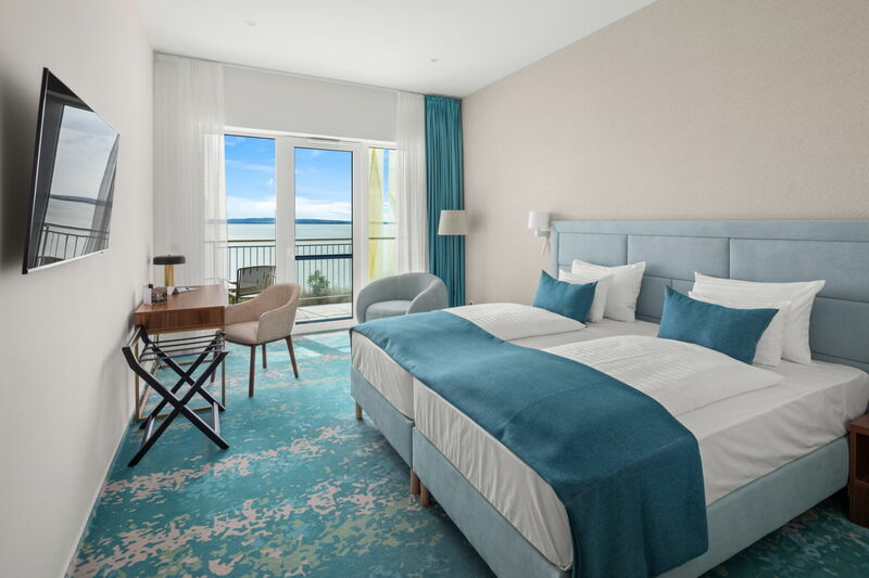 A szálloda 128 tágas, elegánsan berendezett szobája közül mindenki megtalálja a maga elképzeléseinek megfelelőt. A kétágyas szobákon kívül, különböző méretű lakosztályok, valamint családok vagy baráti társaságok részére összekötőajtós, connecting szobák állnak rendelkezésre. Minden szoba terasszal van ellátva, amelyek vagy a parkolóra vagy a Balatonra néznek. A szobák felszereltségéhez továbbá szabályozható légkondícionáló, Smart LED TV, maxibár, széf, fürdőszoba is tartozik.